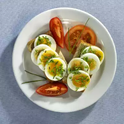 Wash the chives and cut into small rolls except for a few longer tips for garnishing. Sprinkle on toast slices. Clean, wash and slice the tomato. Serve with the tomatoes