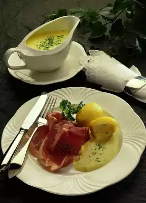 Wash the chives and cut into fine rolls. Add chives to the hollandaise sauce. Peel the potatoes. Arrange potatoes, hollandaise sauce and ham on plates and garnish with parsley