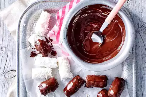 Dip coconut bars one after the other with a fork into the liquid chocolate (hold the pot at an angle), let them drip off a little and let them set on baking paper. Keep in a cool place for about 1 week.
