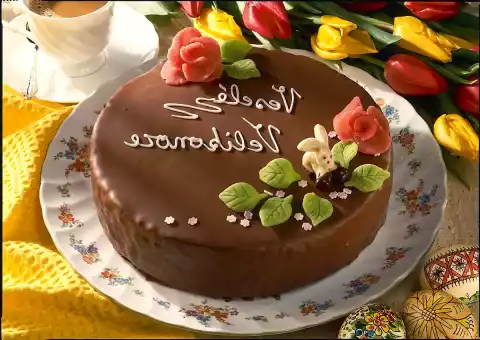 Cut off a small corner. Write "Veselé Velikonoce"/ or "Wesotego Alleluja" on the cake. Decorate with marzipan flowers, leaves, chicks or rabbits. Sprinkle with sugar flowers.