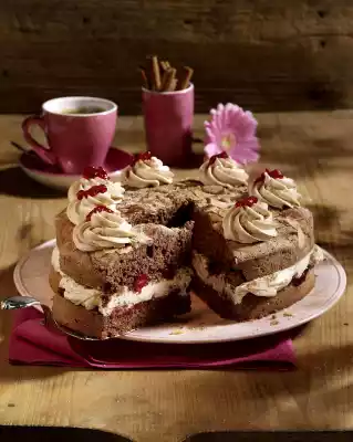 Fold into the egg cream together with the chocolate fat mass. Line the bottom of a springform pan (26 cm Ø) with baking paper. Add the mixture and smooth it down. Sprinkle with almond flakes. Bake in the preheated oven (electric cooker: 175 °C/ convection oven: 150 °C/ gas: level 2) for 20-30 minutes. Let cool on a cake rack. For the cream, stir mascarpone, quark, 100 g sugar and cinnamon until smooth. Pour approx. 1/3 of the cream into a piping bag with a large star-shaped spout. Remove the base from the mould and cut in half horizontally. Spread 100 g cranberries on the bottom cake base. Spread the rest of the cream on top.