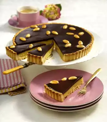 Prick the base of the dough several times with a fork and chill in the mould for about 1 hour. Bake in the preheated oven, 2nd shelf from below, (electric oven: 200 °C/ convection oven: 175 °C/ gas: level 3) for approx. 25 minutes. In the meantime, chop 100 g almonds coarsely and roast them in a pan without fat. Remove from the pan immediately and let it cool down. Roast the remaining whole almond kernels (approx. 20 pieces = 30 g) in the same way and let them cool down. Let the baked shortcrust pastry base cool down in the pan for about 10 minutes, then remove from the pan and let it cool down on a cake rack. For the toffee mixture, bring 250 g butter, 400 g cream and syrup to the boil while stirring. Simmer at medium heat for about 25 minutes while stirring continuously until creamy. Spread a thin layer of hot toffee cream on the tart base, sprinkle the chopped almonds on top and cover with the remaining toffee cream. Let it cool down. Chill the tarte for about 1 hour.