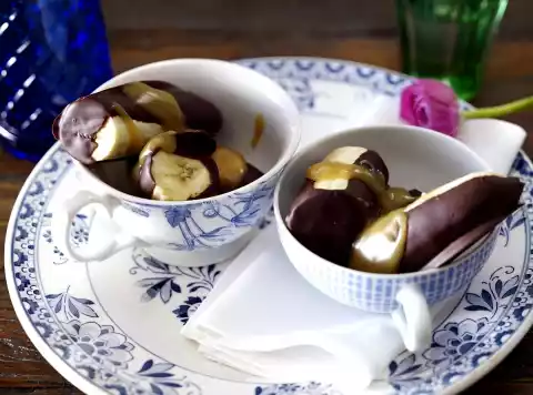 Peel the bananas and, depending on their size, halve or cut them into three. Turn in lemon juice and drain well. Then dip half lengthwise into the liquid chocolate using a fork, drain well and place on a piece of baking paper.