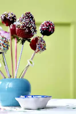 Select the berries, wash if necessary and dab dry well. Chop the chocolate coating (separated according to variety) and melt in a hot water bath. Put the berries on skewers and carefully pull them through a kind of chocolate coating.