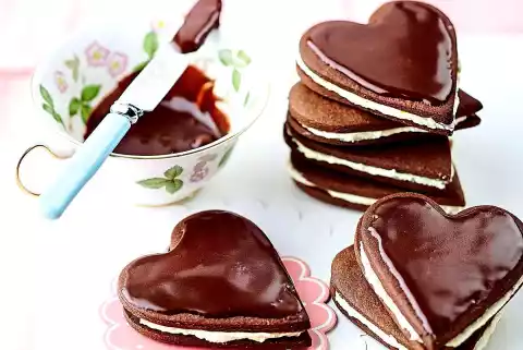 For the chocolate icing, sieve 120 g icing sugar and 2 tablespoons of cocoa into a bowl. Mix with about 2 tablespoons of orange juice to a thick icing. Decorate hearts with it. Leave to dry and store in a cool place.