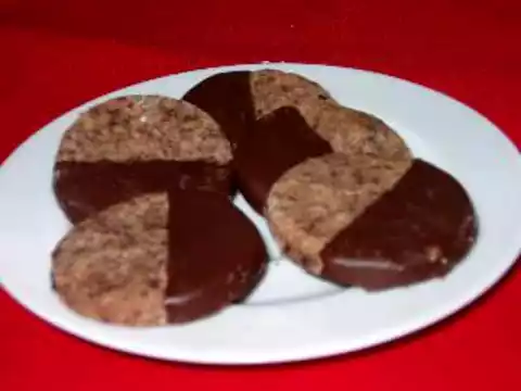 Knead into a dough and put it in a cool place. Roll out the thickness of a knife and cut out round. Bake at approx. 150°C - 175°C for a few minutes. When they are cold, coat with chocolate icing and leave to rise. Sprinkle with pistachios.