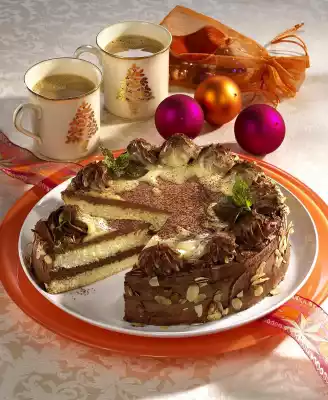 Let the finished sponge cake cool in the mould for approx. 10 minutes, remove from the mould and allow to cool completely. Roast the flaked almonds in a pan without fat until golden brown, take them out and let them cool down. Cut the sponge cake once. Whip the chocolate cream with the whisk of the hand mixer. Pour 4 tablespoons of cream into a piping bag with star-shaped spout. Spread 1/3 of the remaining cream on the lower sponge base. Place the second cake base on top. Spread the rest of the cream on the cake surface and all around. Decorate with chocolate tuffs and sprinkle with flaked almonds. Chill for about 1 hour. Sprinkle with advocaat just before serving. Decorate with mint and serve dusted with cocoa