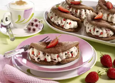 Quarter 2 strawberries. Clean the remaining strawberries and cut them into small cubes. Whip the cream, vanilla sugar and 2 tablespoons of sugar until stiff, while pouring in the cream stabiliser. Fold in strawberry cubes and chocolate pieces. Pour cream into a piping bag with a large perforated spout and squirt between the omelettes. Chill the omelettes. Before serving, decorate with strawberry quarters and dust with icing sugar