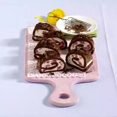 Whip cream until stiff and fold in. Fold in rhubarb. Roll out the cold sponge cake and spread with the cream. Roll up the sponge cake and chill for at least 4 hours. Grate the chocolate coating with the peeler into shavings. Decorate sponge roll with chocolate shavings and dust with cocoa