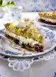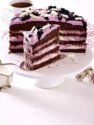 Crush 50 g blackberries with a fork. Peel the chocolate with a peeler into small rolls. Remove the cake from the ring and decorate with bromeberries and chocolate