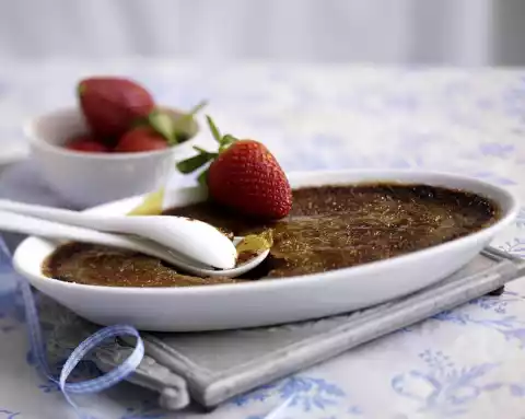 Caramelise with the Bunsen burner or under the hot grill of the oven until golden brown. Serve with fresh strawberries.