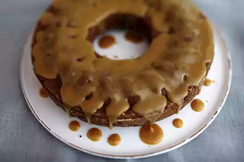 Chop 150 g candies for the glaze. Heat with 100 g cream and melt while stirring. Simmer caramel cream at medium heat for about 5 minutes, stirring more often. Let it cool down for about 5 minutes and drizzle over the cake.