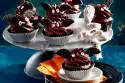 Chill for about 10 minutes. Spread the cake except for 1 tablespoon for garnishing. Pour the rest of the chocolate cream into a piping bag with a very small perforated nozzle and garnish the meringue tuffs with dots as faces.