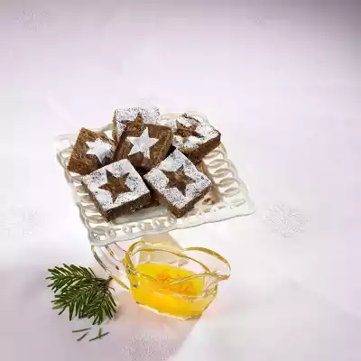 First stir in the cooled chocolate, then the flour, almonds and raisins. Beat the egg white until stiff, fold in. Fill into a greased, square springform pan (23 x 23 cm). Bake in a preheated oven (electric cooker: 200 °C/ convection oven: 175 °C/ gas: level 3) for about 20 minutes. Turn off the oven and let the cake rest for another 10 minutes. Cut the cake into pieces and dust with icing sugar using star-shaped templates. For the sauce, wash an orange and peel half of it with the zest shredder. Squeeze all oranges and lemon. Melt 200 g sugar in a small pot. Add the squeezed juice and orange zest.