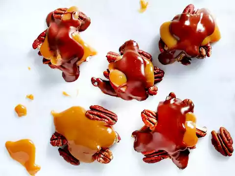 Line a baking tray or tray with baking paper and place about 25 small heaps of nuts on top. Spread the caramel evenly with a spoon and let it dry for about 1 hour.