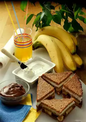 Dab the banana slices dry and place them on the nut nougat cream. Place the cheese coated slices on top and cover with the uncoated bread slices. Cut each bread diagonally into four pieces.