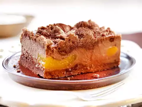Drain the apricots in a sieve. Melt 325 g butter. Mix flour, 300 g sugar and cocoa powder. Add liquid butter, egg yolk and 4 tbsp. water to the flour mixture and knead into crumbles. Grease a fat pan (32 x 39 cm) and dust with flour. Spread 2/3 of the crumbles on it and press it firmly to a base