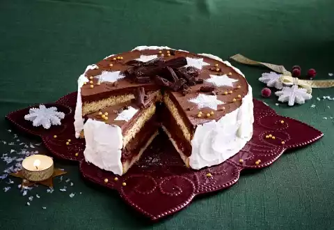 Remove the cake from the ring. Whip 200 g cream until stiff. Spread the edge with the cream. Decorate cakes with icing sugar stars, bark chocolate and sugar pearls.