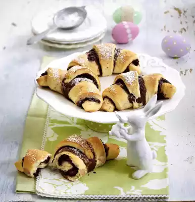 Roll out the dough thinly (25-30 cm Ø) on a well floured work surface. Spread the dough with nougat cream, leaving about 1 cm free at the edges. Spread cherries on top and cut the circle into 12 cake pieces. Roll up each cake piece from the edge to a croissant