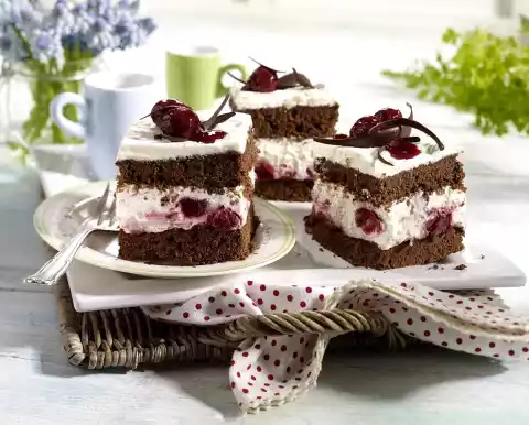 Put the dough on top and smooth it down. Bake in the preheated oven (electric cooker: 200 °C/ convection oven: 175 °C/ gas: level 3) for 20-25 minutes. Let them cool down. Wash the cherries, remove the stalks and stone them. Put 100 ml water, cherries and 50 g sugar in a saucepan. Bring to the boil and stew for 5-7 minutes. Drain the cherries and let them cool down. Turn out the chocolate cake plate and remove the baking paper. Cut the plate in half crosswise and turn it over again. Mix cherries with jam. Put some cherries aside for decoration. Mix cream firmer, 50 g sugar and 1 sachet vanilla sugar.