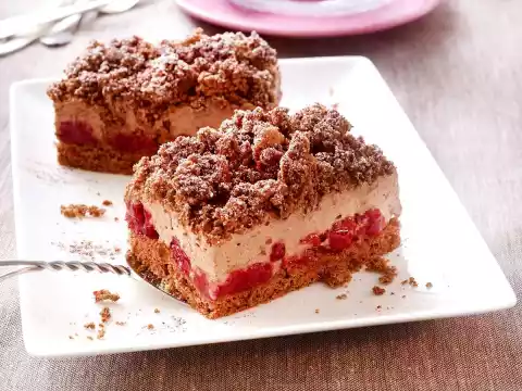 Then cut off 1/3 of the dough (approx. 32 x 13 cm) and crumble. Dab the cherries dry again with kitchen paper and spread evenly on the dough. Whip the mint cream with the whisk of the hand mixer until stiff. Spread evenly on the cherries. Spread the crumbs evenly on top, press down lightly. Chill for about 2 hours. Mix cocoa and icing sugar. Then dust with cocoa icing sugar and cut into pieces