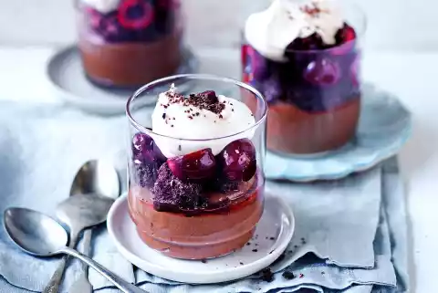 Whip the crème fraiche with the whisk of the mixer for approx. 3 minutes, adding the sugar. Crumble the brownie. Spread the brownie, cherries and crème fraiche in the glasses. Sprinkle with the chocolate shavings and chill for about 1 hour.