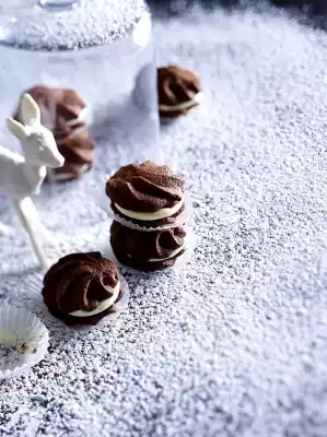 Bake in a preheated oven (electric cooker: 200 °C/ convection oven: 175 °C/ gas: see manufacturer) for 6-8 minutes, allow to cool. Fill chocolate cream into a piping bag. Spray cream on the underside of 35 biscuits. Place the remaining biscuits on top and press down slightly. Packed cool and airtight, the shortbreads will keep for about 2 weeks.