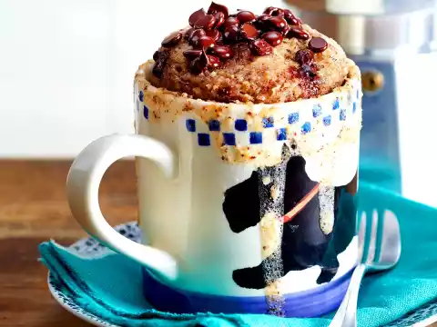 Mix ground hazelnuts, flour, sugar, vanilla sugar, baking powder and salt in a greased cup. Add egg, milk and oil. Stir well with a fork. Fold in 2 tablespoons of chocolate drops. Place cup on a saucer.