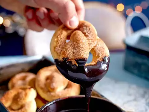 Brush the pretzels very thinly with water. 1⁄2 Mix TL cinnamon and 2 tablespoons sugar and sprinkle pretzels with it. Bake in a hot oven for about 15 minutes. Serve with the chocolate sauce.