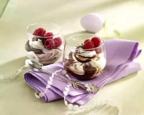 Stir mascarpone and milk until smooth. Stir in sugar, quark and vanillin sugar and season to taste with some lemon juice. Add chocolate to the cream, stir in briefly and fill into glasses immediately. Decorate with raspberries and drizzle with the sauce.