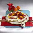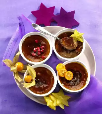 Remove the moulds from the water bath and allow to cool. Then place in the refrigerator for at least 3 hours. Wash, drain and slice the carambola and kumquats. Tear the physalis into small blossoms. Shortly before serving, sprinkle cream with cane sugar, place on a grate and caramelise under the preheated grill, highest setting SHORTLY. (or better with a gas burner caramelize). Serve crème brûlée decorated with exotic fruits and pomegranate seeds