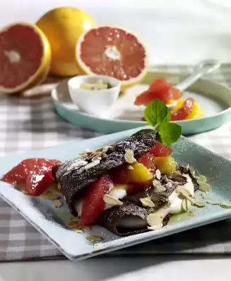 Caramelise 2 tablespoons of sugar in a pan until golden brown, then deglaze with the juice and cook the caramel over medium heat for about 2 minutes. Remove 2-3 tablespoons of juice and set aside. Stir the starch and 1 tablespoon of cold water until smooth and bind the fruit stock with it. Let simmer for about 1 minute while stirring. Add orange and grapefruit fillets to the stock and chill. Mix flour, eggs, 1 tablespoon sugar, cocoa and milk with the whisk of the hand mixer until smooth and let it swell for about 15 minutes. Lightly roast the almonds in a pan without fat. Mix quark, sour cream, vanilla sugar, grated orange peel and 1 tablespoon of sugar and season to taste with the juice set aside. Brush a coated pan with 1/2 teaspoon of oil each and heat up. Put 1/4 of the crêpe dough into the pan and immediately sprinkle each with approx. 1 tablespoon of flaked almonds. Turn the crêpe after about 2 minutes and fry it again for about 2 minutes.