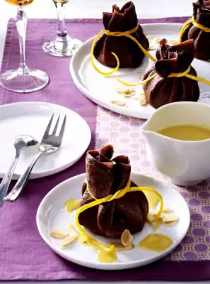 Place the crêpes next to each other on the work surface. Put a blob of chocolate mousse and a few flaked almonds on each crêpe. Fold the crêpes over the mousse into a packet and tie with orange strips.