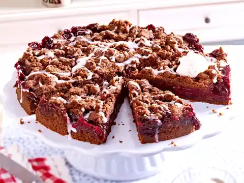 Spread 2/3 of the sprinkles on a greased springform pan (26 cm Ø), press them to a base with your hands. Spread the cherries on the crumble base. Sprinkle the rest of the crumbles evenly on top