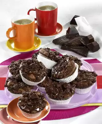 Melt 50 g chopped chocolate coating in a hot water bath. Pour into a freezer bag, cut off a small corner. Decorate muffins with it in strips. Leave to dry