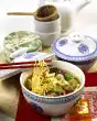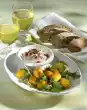 Carefully heat up again, stirring constantly until the cream thickens a little (the cream must not boil). Let it cool down a little. Put some chocolate crunchy pralines aside for decorating, chop the rest finely. Beat 2 egg whites and salt until stiff. Fold in 2-3 portions of the chocolate crunchy pralines. Pour the mousse into a flat bowl and chill for approx. 4 hours. Defrost raspberries at room temperature. Puree the apricots in their juice and the raspberries separately. Pass the raspberries through a sieve and mix with sugar. Pour the 2 sauces onto 4 plates and let them run into each other. Cut the mousse into balls with an ice-cream scoop. Dip the ice cream scoop in hot water in between.