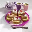 Puree 100 g raspberries and pass through a sieve. Beat the egg whites and 100 g sugar in a bowl with the whisk of the hand mixer on a hot water bath until the sugar is dissolved. Remove from heat and beat cold for 7-10 minutes until peaks form. First slowly stir in 175 g soft butter, then raspberry puree. Fill the cream in a piping bag with star-shaped spout and squirt in small tuffs onto the muffins. Decorate with raspberries and keep cool until serving