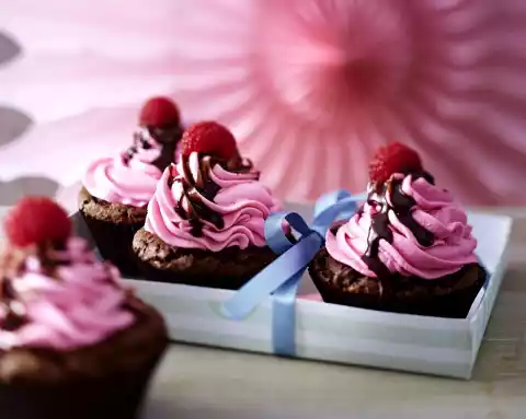 Spray a tuff on each muffin. Decorate each muffin with 1 raspberry and chocolate sauce just before serving.