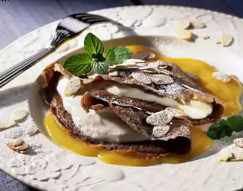 Divide the sauce between 4 plates. Fill crêpes with quark, cut in half and arrange on top. Sprinkle with almonds and icing sugar