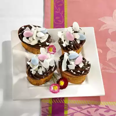 Grease 12 oval muffin cups, dust with flour and fill in the dough evenly. Bake in the preheated oven (electric cooker: 200 °C/ convection oven: 175 °C/ gas: level 3) for 20-25 minutes. Remove the muffins from the oven and let them cool on a cake rack for 10 minutes. Remove muffins from the tin and let them cool completely. Pour chocolate cream into a piping bag with a star-shaped spout and spray it onto the muffins. Decorate with coconut chips and almond-sugar eggs