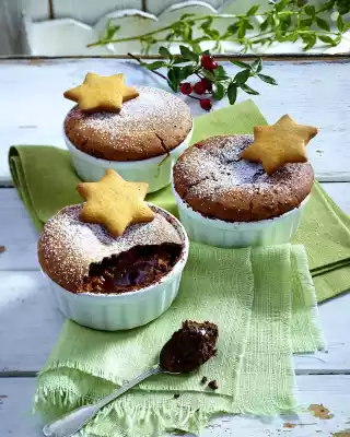 Carefully fold in the egg white and distribute into the prepared moulds. Bake in the preheated oven (electric cooker: 175 °C/ convection oven: 150 °C/ gas: see manufacturer) for approx. 12 minutes. Dust with icing sugar and decorate with cookies.