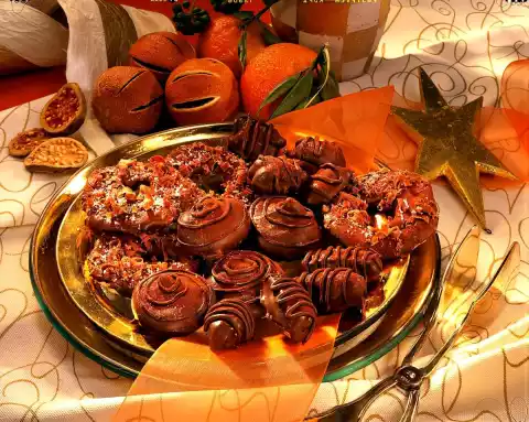 Sprinkle the still moist apple rings with it. Pour the remaining melted mass into a small freezer bag and cut off a small corner. Decorate dates and figs with it. Dust all fruits with cocoa, possibly sprinkle with sugar. Results in 40 fruits