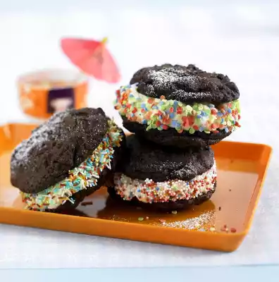 Place cookies in the freezer 45 minutes before serving. Let the ice cream thaw briefly. Add 1 tablespoon of ice cream to each 14 biscuits. Place 1 cookie on each and press down slightly. Roll the sandwiches in different sugar decorations and dust with icing sugar. Wrap ice cream sandwiches that are not eaten immediately in aluminium foil or freezer bag and put them in the freezer