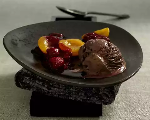 Put the apricots in a sieve and let them drain. Stir the remaining raspberries into the lukewarm chilli raspberries. Divide 1 scoop of ice cream and apricots each on 4 plates. Pour raspberry-chilli over the apricots