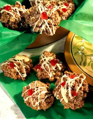 Finely grate the chocolate. Mix nuts and almonds with an egg white. Add chocolate and sugar. Beat the remaining egg whites until very stiff. Fold into the nut mixture. Using two teaspoons, place small heaps on two baking trays lined with baking paper.