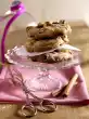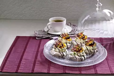 Melt the couverture over a warm water bath, fill into a freezer bag, cut off a small tip. Pour the chocolate coating in thin strips over the meringue shells. Decorate with pistachios