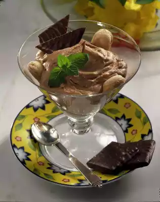 Finally, briefly stir in the yoghurt. Place 3 sponge fingers in each glass and spread the cream in the glasses. Halve the remaining chocolate mint bars and decorate the cream with them. Keep cool until serving, then decorate with a mint leaf