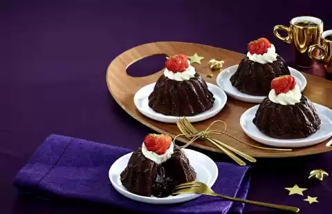 Fill 6 greased, sugar sprinkled moulds (each containing approx. 150 ml) with approx. 3/4 each. Bake in a preheated oven (electric cooker: 175 °C/ convection oven: 150 °C/ gas: see manufacturer) for 10-12 minutes.