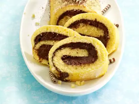 Spread the cream on the completely cooled, rolled out sponge cake. Re-roll the sponge cake from the long side using the tea towel. Refrigerate the roll for at least 1 hour. Remove the roll, dust with cocoa and decorate with zebra rolls.