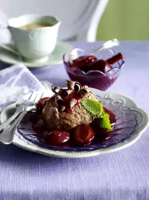 Shape the mousse into balls with a large ice-cream scoop or form cams with two tablespoons. Arrange some plum compote with the mousse. Add the rest of the compote.